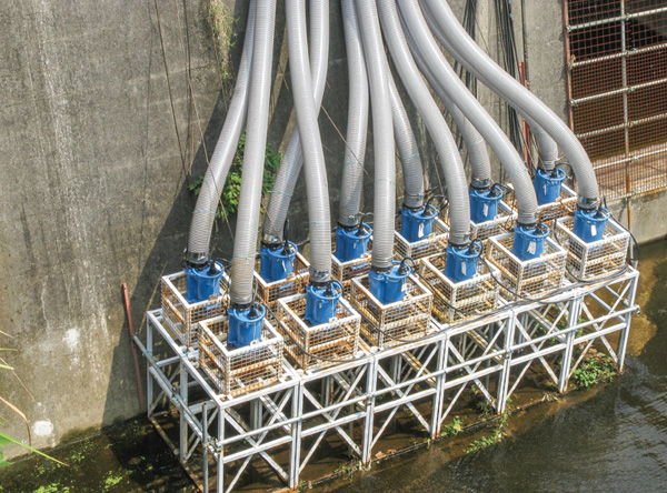 臨時設置的特大暴雨對策設備 日本 作為應對特大暴雨的對策,客戶購入了12台沉水式排水泵 KRS型設備。 客戶处事先常設有可安裝排水泵的設備,僅在暴雨來臨的季節,才由自治體租用並臨時設置排水泵與發電機。客戶所購入的設備是一款可即時回應短時間內集中降雨(即特大暴雨)的簡易雨水排水設備。排水泵易於安裝、拆卸,且具有良好的可維護性,廣受好評。 產品 一般工事用泵 型號 : KRS KRS2-8S [ 12 台 ] 返回一覽